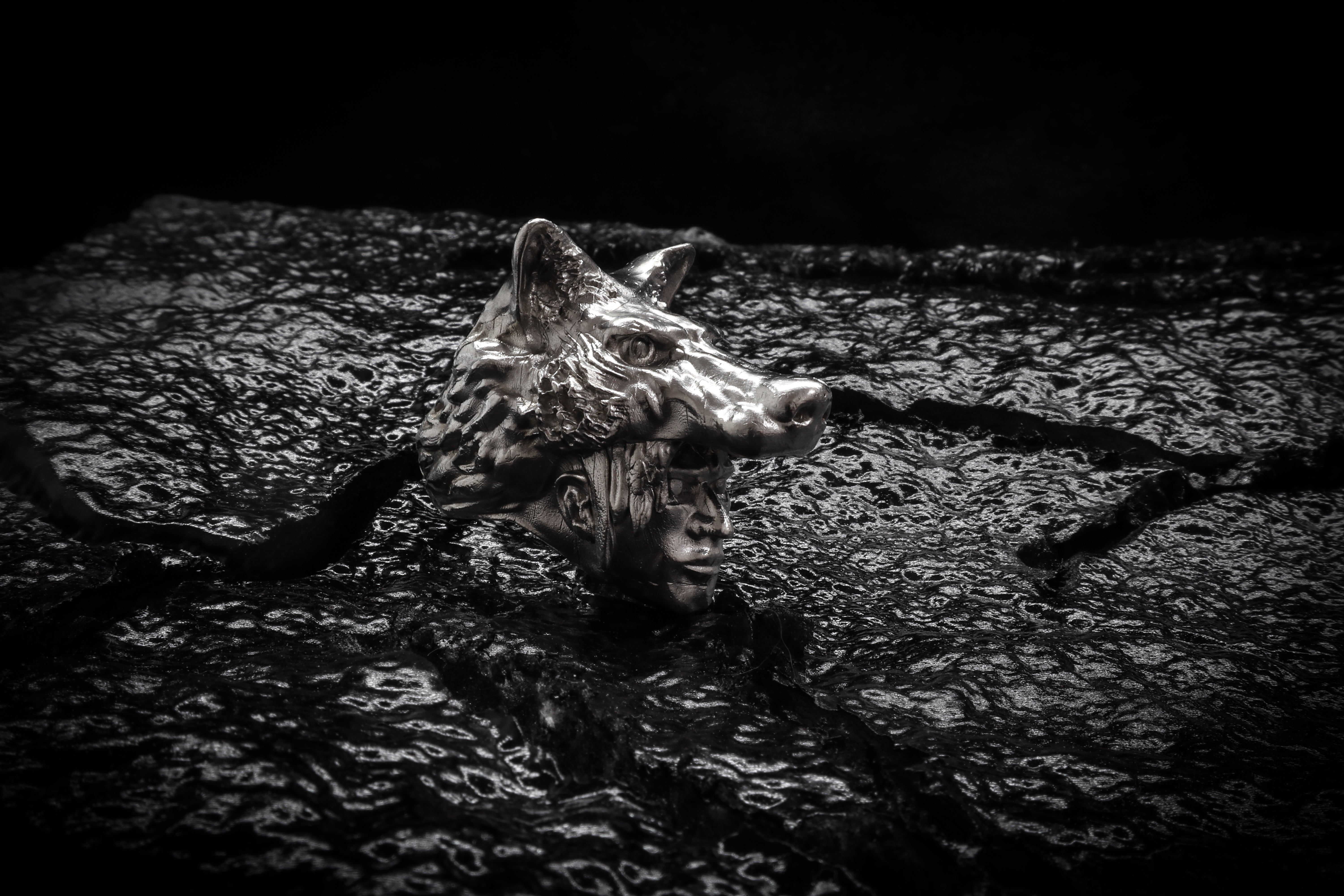 Introducing our extraordinary Wolfguy Ring, a captivating piece inspired by the concept of a man wearing a hat crafted from a wolf's head specimen. This unique ring embodies a distinctive style.
